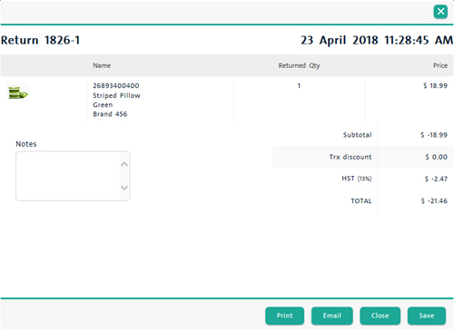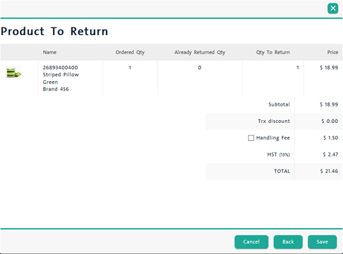 A Return popup appears, showing the item(s) returned, subtotal, returned shipping and/or handling fees if selected in step 7 and the total amount returned.